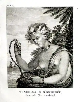 Barkley and his wife, Frances Barkley, left for the Pacific via Cape Horn on 24 November 1786. They stopped in the Hawaiian Islands where a maidservant named Wynee (Winée) was taken aboard. Wynee became the first Native Hawaiian, or "Kanaka", to reach British Columbia.[5] From Hawaii, Barkley sailed the Imperial Eagle to Nootka Sound, on the west coast of Vancouver Island, arriving in June 1787. At 400 tons, the Imperial Eagle was the largest ship to ever enter the main harbour of Friendly Cove in Nootka Sound.[5]