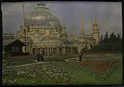 Muralist Francis Davis Millet was selected to be director of decoration for the 1893 World's Columbian Exposition in Chicago, and Turner, who had been runner-up for the job, agreed to be his assistant.[4]: 25 Eight years later, Turner was colorist for the entire 1901 Pan-American Exposition in Buffalo, New York.[4]: 26 The Chicago exposition had been nicknamed "The White City," because of the color of all but one of its major buildings. Turner described his ambitious color scheme for the Buffalo exposition: