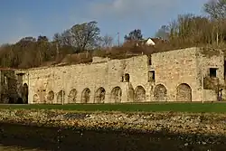 The fourteen massive lime kilns built of dressed-sandstone are a remarkable feature of Charlestown.[3] They are regarded as one of the most important Industrial Revolution remains in Scotland and indeed the United Kingdom, being Scottish Category A Listed buildings.[4][5] Built into the hillside below the village, they form a stone facade 110 metres long by 10 metres high.[6] They are in a generally stable state of preservation [7] with many features relating to the operation of the kilns still in situ. Most of the kilns were re-faced, probably in the 19th century.[8]