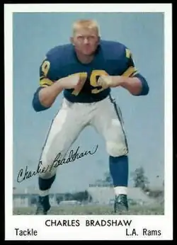 Charles Marvin Bradshaw (March 13, 1936 – January 23, 2002) was an American professional football player who was an offensive tackle for 11 seasons in the National Football League (NFL), primarily with the Pittsburgh Steelers. He served for a time as the head of the NFL Players Association. Bradshaw earned a law degree during the offseason and after his career practiced law in Dallas, Texas until the time of his death from cancer.[1]