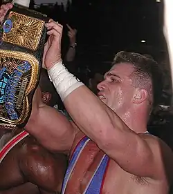 He won the New Legacy Championship at Ballpark Brawl V on August 13, 2005, defeating then-champion Christopher Daniels and Chris Sabin in a triple threat match.[35] He successfully defended the title the next night at Ballpark Brawl VI against Harry Smith with Mick Foley as a referee.[36][37]