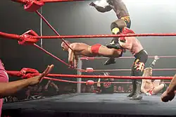 Early in 2008, Haas developed a gimmick in which he would go under the ring in the middle of his matches and re-emerge wearing a mask.[61] In this "alter-ego", Haas would sometimes perform luchador-esque maneuvers in a comical fashion (such as attempting a diving splash, but instead landing on his feet and hitting a standing splash).[62] The opponent would often unmask Haas mid-match, returning him to his normal demeanor.[61] During this persona, Haas usually competed in dark matches before the live broadcast of Raw or on Heat.[2]
