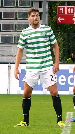 On 17 September 2011 he was sent off against Rangers for a second bookable offence, a challenge on Steven Davis.[38] Mulgrew scored his first SPL goal for Celtic on 15 October 2011, a headed equaliser at Rugby Park as Celtic came back from 3–0 down to draw 3–3 with Kilmarnock.[39] On 7 April 2012, Celtic beat Kilmarnock at Rugby Park to confirm them as Scottish Premier League champions. Mulgrew scored two and set up two in the 6–0 win.[40] On 29 April 2012, he scored Celtic's first goal in a 3–0 victory over Rangers.[41] His performances won him the SPL,[42] Players'[43] and writers' player of the year awards for 2011–12.[44] He also picked up Celtic's Player of the Year and Player's Player of the Year awards.[45][46]