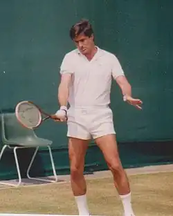 In 1969, Pasarell played Pancho Gonzales in what was, until 2010, the longest match in Wimbledon history in terms of the number of games played. The 41-year-old Gonzales finally defeated the 25-year-old 22–24, 1–6, 16–14, 6–3, 11–9 after a battle that lasted 5 hours and 12 minutes.[5] Pasarell was also the first man to beat the reigning champion in the first round at Wimbledon when in 1967 he beat Manuel Santana. In 1968, he narrowly lost to Ken Rosewall in the second round. Rex Bellamy, tennis correspondent of The Times, started his article the next day by stating that "The first open Wimbledon produced its first great match", and further stated: "Among the men who climb to high places there is a saying that the mountains bring you three things - men, battle, and beauty. The men are true, the battle is the only kind worth fighting, and the beauty in life. Rosewall and Pasarell took us to the mountains yesterday - and the air was like wine." Finally, after covering other matches, the article ends, "Yet the abiding memory will be of Rosewall and Pasarell. If they show films in Valhalla, this is a match the gods will want to see."[6] Pasarell achieved his best result at Wimbledon in 1976, when he lost in the quarterfinals to former world No. 1 Ilie Năstase, after wins against Jun Kamiwazumi, Vijay Amritraj, Adriano Panatta (ranked No. 4 in the world, having won both the Italian and French Opens), and Phil Dent.