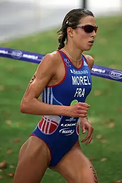 Having finished the local collège in Draguignan in 2004, Morel was admitted to the triathlon section of the Pôle Espoir CREPS PACA, a high performance centre situated in a small pine forest in Boulouris close to St. Raphael which closely collaborates with the Lycée Saint Exupery, a high school in St. Raphael. Since then, and up to now, Pierre Houseaux has been Morel's trainer and she still lives in Boulouris (Aigue Bonne) even though she joined the triathlon club of Beauvais in 2006 and, like the well-known triathletes Sylvain Sudrie, Laurent Vidal, Emmie Charayron and Delphine Pelletier, she enrolled at the Military School Ecole d’application d’infanterie (= EAI), then in Montpellier, in December 2007 (grade: soldat 1re classe; 2012: caporal). In 2008 Moreland her EAI team won the gold medal at the Military World Championships in Estonia, in the individual ranking Morel placed 5th. At the Military World Championships 2011 in Rio de Janeiro (24 July 2011) Morel placed 5th again, the French female team placed fourth and the French mixed team won the gold medal. [1] In 2012, Morel won the bronze medal at the Military Triathlon World Championship in Lausanne (25 August 2012).