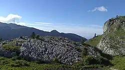 Charmant Som is located within the Chartreuse Regional Nature Park, which was created in 1995 and, since the revision of its charter in 2008, covers 767 km2 (296 sq mi).[57] The summit is also classified as a type I Natural area of ecological, faunal and floristic interest, covering 1,140.8 hectares (2,819 acres) from the mountain's two northern crests to La Pinéa, including the mountain pastures.[13] Finally, the northern slope of the mountain, as far as the Gorges du Guiers Mort to the north and the Col de la Grande Vache to the west,[58] is part of a Natura 2000 zone designed to preserve biodiversity over 2,329 hectares (5,760 acres) under the name "Ubacs du Charmant Som et Gorges du Guiers Mort". It has been recognized as a Site of Community Importance (SCI) since 2013.[14]