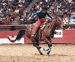 Charmayne James, born June 23, 1970, in Boerne, Texas,[1] was raised in Clayton, New Mexico. She was three years old when she first started riding horses, and by age six she was running barrels. Her recollection of barrel racing is that it was the only thing she ever wanted to do.[2] She began her rodeo career at a young age when she joined the Rabbit Ear 4-H Club.[3] Prior to 2019, barrel racing was the only event women competed in at Professional Rodeo Cowboys Association (PRCA) events,[4] and is second only to bull riding as the most popular event.[2]