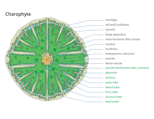 - ^ Nishiyama, Tomoaki; Sakayama, Hidetoshi; de Vries, Jan; Buschmann, Henrik; Saint-Marcoux, Denis; Ullrich, Kristian K.; Haas, Fabian B.; Vanderstraeten, Lisa; Becker, Dirk (2018). "The Chara Genome: Secondary Complexity and Implications for Plant Terrestrialization". Cell. 174 (2): 448–464.e24. doi:10.1016/j.cell.2018.06.033. ISSN 0092-8674. PMID 30007417.