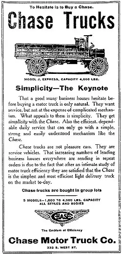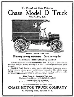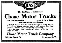 Chase Motor Truck Company (1907–1919), founded by Aurin M. Chase, was a manufacturer of trucks in Syracuse, New York. The vehicles were known for their air-cooled engines and simplicity of design.