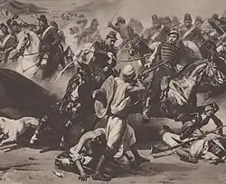 In addition to numerous campaigns in North Africa, these colorful regiments also served in the Crimean War, Second Italian War of Independence, Franco-Prussian War, Indochina, France's invasion of Mexico, Dahomey (1892), Madagascar (1895) and both world wars.[4] The 1st and 4th Regiments of Chass. d'Af. distinguished themselves by securing the flank of Lord Cardigan during the ill-fated Charge of the Light Brigade.[5] On this and other occasions they used their characteristic African tactic of advancing rapidly in open order,[6] in contrast to the rigid lines of the Light Brigade.