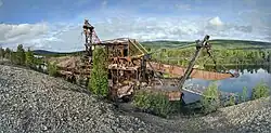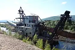 The Chatanika gold dredge was a historic relic of gold dredge #3 owned and operated by F.E. Company between 1928 and 1958. The dredge is located at about 27.5 miles (44.3 km) along the Steese Highway east of Fairbanks in a 60 acres (24 ha) pond it dug itself, directly across the road from the Chatanika Lodge. The dredge was private property and off-limits to the public.[7] In August 2013 an accidental fire destroyed the dredge.[8]
