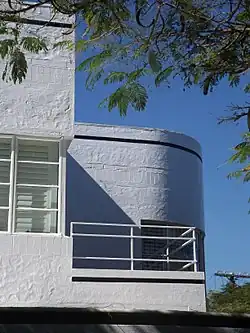 This two-storeyed rendered masonry house, with a flat sheet metal roof concealed behind a parapet wall, sits on a level southeast corner site in Ascot. The building shows a strong Functionalist approach in its design, with architectural and decorative elements including brick banding, which is now painted over, curved corner walls and windows, glass bricks and contrasting vertical and horizontal elements.[1]