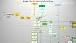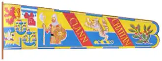 Clan Chattan (Scottish Gaelic: Na Catanaich or Clann Chatain),[5] also sometimes referred to as "Clan Dhugaill" (Quehele) after its progenitor Dougall-Dall, is a unique confederation of Highland clans.[6] This distinctive allied community[7] comprised at its greatest extent seventeen separate clans (currently twelve),[8] who each had their own clan chief recognized under Scottish law, but were further united and bound to the superior chief of the Confederation for mutual solidarity, sustenance and protection in the Middle Ages and early modern period in the Great Glen and Cairngorms. A tribal coalition of this magnitude was a source of apprehension to both the Lord of the Isles and the Kings of Scots and records exist of machinations to "crying doon the Clan Chattan" by fomenting internal dissension.[9]