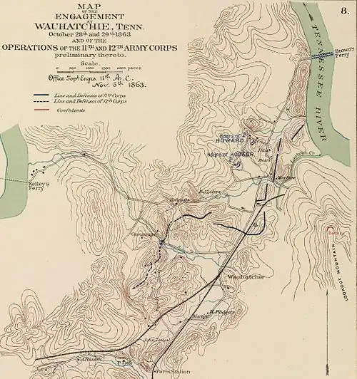 Hooker's column marched through Lookout Valley and linked up with Hazen and Turchin at Brown's Ferry at 3:45 p.m., October 28. Thomas's staff began the preparations to bring supplies over the Cracker Line and he telegraphed General in Chief Henry W. Halleck that he expected "in a few days to be pretty well supplied."[21]