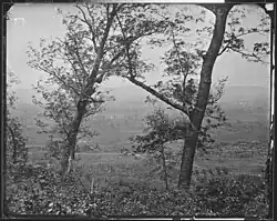 Bragg, having dispatched most of his cavalry, had little means of gathering intelligence. He assumed that Sherman's corps would be heading toward his department's extreme right flank at Knoxville, not Chattanooga. Therefore, he believed that the main Union assault would occur on his left flank, Lookout Mountain. On November 12, Bragg placed Carter Stevenson in overall command for the defense of the mountain, with Stevenson's division placed on the summit. The brigades of Brig. Gens. John K. Jackson, Edward C. Walthall, and John C. Moore were placed on the "bench" of the mountain (a narrow and relatively flat shelf that wrapped around the northern end of the mountain approximately halfway to the summit). Jackson later wrote about the dissatisfaction of the commanders assigned to this area, "Indeed, it was agreed on all hands that the position was one extremely difficult to defense against a strong force of the enemy advancing under cover of a heavy fire."[33] Thomas L. Connelly, historian of the Army of Tennessee, wrote that despite the imposing appearance of Lookout Mountain, "the mountain's strength was a myth. ... It was impossible to hold [the bench, which] was commanded by Federal artillery at Moccasin Bend." Although Stevenson placed an artillery battery on the crest of the mountain, the guns could not be depressed enough to reach the bench, which was accessible from numerous trails on the west side of the mountain.[34]