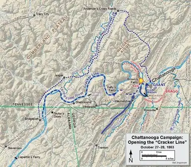 The chief engineer of the Army of the Cumberland, Brig. Gen. William F. "Baldy" Smith, had devised a plan with Rosecrans to open a more reliable supply line to the troops in Chattanooga. General Thomas put the plan afoot immediately upon taking command. Smith briefed Grant immediately after the new commander's arrival and Grant enthusiastically concurred with the plan. Brown's Ferry crossed the Tennessee River from Moccasin Point where the road followed a gap through the foothills, turned south through Lookout Valley to Wauhatchie Station, and then west to Kelley's Ferry, a navigable point on the Tennessee that could be reached by Union supply boats. If the Army of the Cumberland could seize Brown's Ferry and link up with Hooker's force arriving from Bridgeport, Alabama, through Lookout Valley, a reliable, efficient supply line—soon to become known as the "Cracker Line"—would be open. In addition, a force at Brown's Ferry would threaten the right flank of any Confederate movement into the valley.[17]