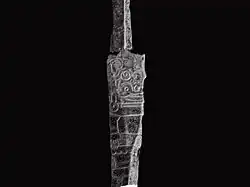 The "New Temple", constructed between 500 and 200 BC, is also based on a gallery and plaza design and contained many relief sculptures. The Lanzon deity is shown here, holding a strombus shell in the right hand, while the left hand holds a Spondylus shell, considered to have sacred properties.