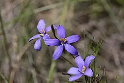 Cheiranthera alternifolia, commonly known as finger-flower,[2] is a flowering plant in the family Pittosporaceae. It is a small shrub with deep bluish-purple flowers, yellow stamens and dull green linear shaped leaves. It is found growing in South Australia.