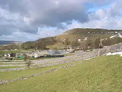 Chelmorton village lines a long street in a high, shallow basin on a limestone plateau,[4] part of the White Peak area of the Peak District National Park. The village is surrounded by a regular pattern of rectangular fields that are bordered by limestone walls; the layout of these indicates that the village had one or possibly two medieval open fields, before enclosure occurred at a subsequent unspecified time.[4]