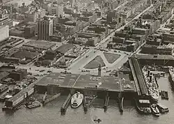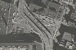 The West Side Elevated Highway, also known as the Miller Highway, was completed from Canal Street to the foot of Smith Park at 23rd Street in late 1930.[65] In 1932, construction began on an extension of the highway between 22nd Street and 38th Street.[66] This section of the highway opened on January 5, 1933.[67] The highway formed an "S"-curve at 23rd Street, where the right-of-way shifted west from 11th Avenue onto 12th Avenue. Because of this, Thomas F. Smith Park was split diagonally into two triangular sections by the highway trestle. The space underneath the elevated highway, meanwhile, was used for parking and storage.[6]: 22–4 [12][49]: 119−120