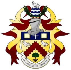 Upon a mount between two branches of oak proper, a fountain thereon a pigeon proper. EscutcheonOr, a chevron engrailed gules between two pigeons argent in chief and an uprooted oak tree in base proper; atop, a chief azure under a cross flory argent between two open books proper binding. MottoSALUBRITAS ET ERUDITIO |