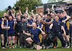 Despite losing on the opening day of the 2013-14 season to Longlevens RFC, the club eventually achieved promotion from Gloucester 1 for the first time in its history as the club soared with a number of new young recruits. They maintained their early good form until the start of November 2 when they lost 13-20 at home to Old Richians rfc. Following this club's form was shaky, but a strong run into the end of the campaign including a 93-0 home win over Kingswood RFC set up a must-win match against fellow promotion chasers Longlevens on the last day of the season. Despite a promising start to the match, Longlevens managed to grab the win 45-38 which saw the Sarries achieve promotion in second behind Bream RFC as they secured two bonus points. The Sarries also performed with their reserve teams as both teams won their respective Merit tables for a second time in a row. The Sarries First XV capitalised on their league performances to capture the Cheltenham Combination Senior Cup for the first time in 30 years, picking up a win over a strong Old Patesians RFC team, however the Sarries reserve teams were unable to secure the Junior Cup or Minor Shield.