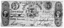 During the Panic of 1857, while 18 New York banks closed in a single day, Chemical continued to make payments in specie. For a few days, it was the only bank to redeem notes in gold instead of in loan certificates; the bank got a nickname, "Old Bullion".[2] The panic, which had hit banks and caused a number of failures, led banks across the country to suspend specie payments and turn to issuing paper promissory notes.[4][5] Chemical's decision was highly unpopular among its fellow banks and led to the bank's temporary suspension from the New York Clearing House, of which Chemical was a charter member since 1853.[6] Chemical developed a reputation for stability. This reputation proved extremely important in Chemical's growth during subsequent recessions during the 1860s.[7]