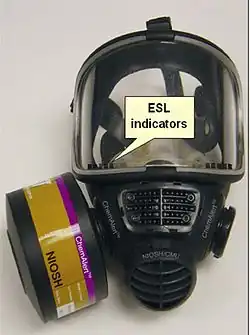 If a cartridge has a device to warn the user of the approaching expiration of the service life (end-of-service-life indicator, ESLI), the indication can be used for timely replacement of cartridges. ESLI can be active[46] or passive.[47] A passive indicator often uses a sensor that changes color. This element is installed in the cartridge at some distance from the filtered air outlet so that the color change occurs before harmful gases begin to pass through the cartridge. An active indicator may use a light or an audible alarm to signal that a cartridge needs to be replaced.