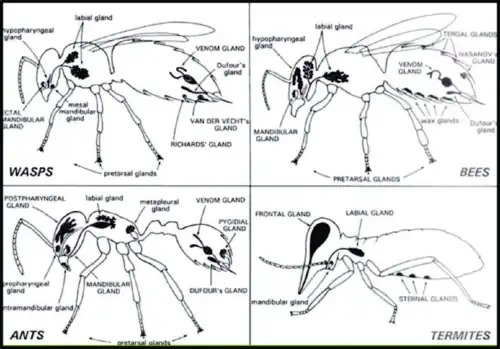 Eusocial insects including ants, termites, bees, and social wasps produce pheromones from several types of exocrine gland. These include mandibular glands in the head, and Dufour's, tergal, and other glands in the abdomen.[5]