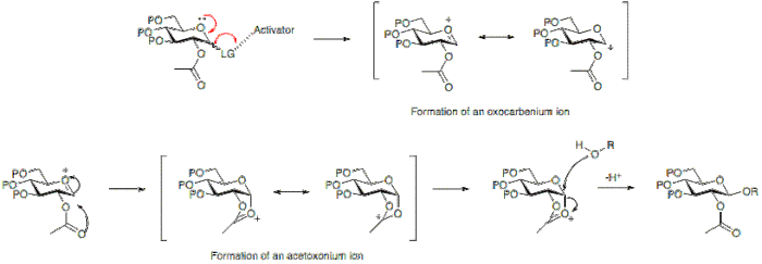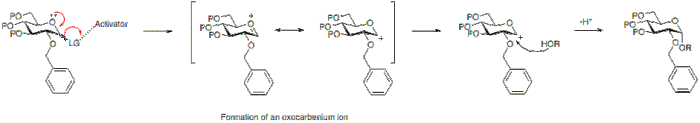 An activator is commonly a Lewis acid which enables the leaving group at the anomeric position to leave and results in the formation of the oxocarbenium ion.