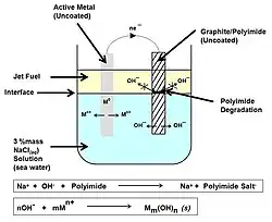 Polymer degradation by galvanic action was first described in the technical literature in 1990 by Michael C. Faudree, an employee at General Dynamics, Fort Worth Division.[16][17] The phenomenon has been referred to as the "Faudree Effect",[18] and can possibly be used as a sustainable process to degrade non-recyclable thermoset plastics, and also has had implications for preventing corrosion on aircraft for safety such as changes in design.[19][20] When carbon-fiber-reinforced polymer is attached to a metal surface, the carbon fiber can act as a cathode if exposed to water or sufficient humidity, resulting in galvanic corrosion. This has been seen in engineering when carbon-fiber polymers have been used to reinforce weakened steel structures.[21][22] Reactions have also been seen in aluminium[23] and magnesium alloys,[24] polymers affected include bismaleimides (BMI), and polyimides. The mechanism of degradation is believed to involve the electrochemical generation of hydroxide ions, which then cleave the amide bonds.[25]