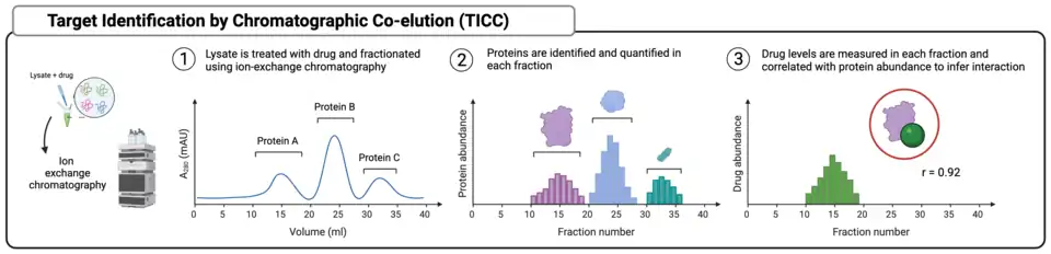 Target identification by chromatographic co-elution does not rely on differences in protein stability after drug treatment. Instead, it rests on the assumption that drugs form stable complexes with their target proteins, and that those complexes are robust enough to survive a chromatographic separation. In a typical workflow, a cell lysate is incubated with a drug, then the lysate is injected onto an ion-exchange chromatography system and fractionated. Lysate proteins are eluted along an ionic strength gradient and fractions are collected over short time intervals. Each fraction is analyzed by LC-MS/MS for both protein and drug content. Individual proteins elute with characteristic profiles, and pre-incubated drugs should mirror the elution profiles of the targets they complex with. Correlation of drug and protein elution profiles allows for targets to be narrowed down and inferred.[22]