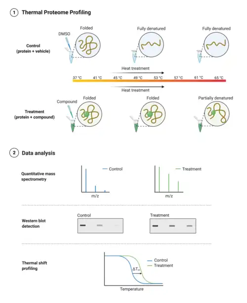 Thermal proteome profiling (also, Cellular Thermal Shift Assay) is recently popularized strategy to infer ligand-protein interactions from shifts in protein thermal stability induced by ligand binding. In a typical assay setup, protein-containing samples are exposed to a ligand of choice, then those samples are aliquoted and heated to separate individual temperature points. Upon binding to a ligand, a protein's thermal stability is expected to increase, so ligand-bound proteins will be more resistant to thermal denaturation. After heating, the amount of non-denatured protein remaining is analyzed using quantitative proteomics and stability curves are generated. Upon comparison to an untreated stability curve, the treated curve is expected to shift to the right, indicating that ligand-induced stabilization occurred. Historically, thermal proteome profiling has been assessed using a western blot against a known target of interest. With the advent of high resolution Orbitrap mass spectrometers, this type of experiment can be executed on a proteome-wide scale and stability curves can be generated for thousands of proteins at once. Thermal proteome profiling has been successfully performed in vitro, in situ, and in vivo. When coupled with mass spectrometry, this technique is referred to as the Mass Spectrometry Cellular Thermal Shift Assay (MS-CETSA).[17]