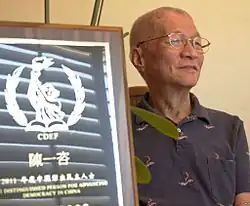 Chen Yizi (Chinese: 陈一谘; July 20, 1940 – April 14, 2014) was a Chinese scholar and economist who served as the director of China's Institute for Economic Structural Reform (中国经济体制改革研究所).[1][2][3] Chen was a top adviser to Zhao Ziyang, General Secretary of the Chinese Communist Party between 1987 and 1989, as well as to the Chinese government.[1][2][3]