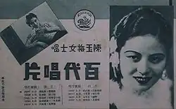 In 1928 Tianyi's star actress Hu Die defected to the Mingxing Film Company, Tianyi's main rival, and Chen Yumei replaced her as Tianyi's number one actress.[2] She starred in more than 30 movies made by Tianyi, most notably A Girl Named Yunlan (芸兰姑娘, 1932), Livelihood (生机, 1933), and The Struggle (挣扎, 1933). Many of her roles were of a tragic nature. During an interview, she named Livelihood, a progressive movie banned by the Shanghai Municipal Council, as one of her favourite films.[2]: 114 She sang many of the theme songs in her movies, several of which topped the charts, and she released a record by Pathé Records.[2]: 115