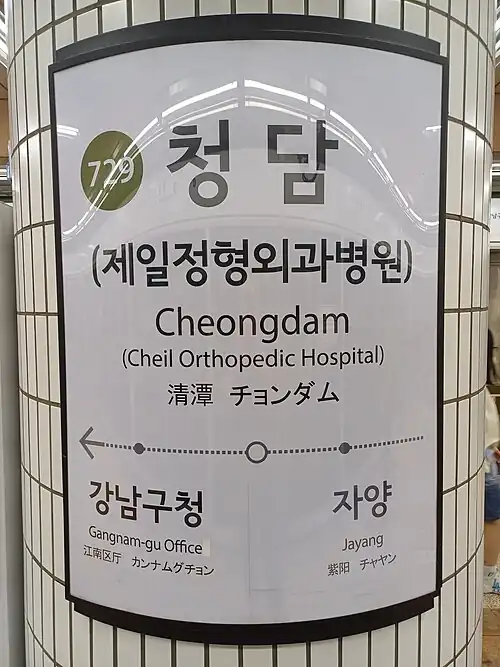 Cheongdam is a station on Line 7[1] of the Seoul Metropolitan Subway. Wooridul Spine Hospital is located near the station.