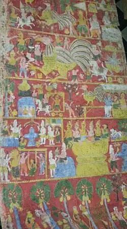 Charanachitras, Mankhas, Yamapatas were ancient form of paintings executed on textile-scrolls and dealt with themes of a narrative-didactive nature of storytelling which finds mentions in Hindu, Jain and Buddhist texts.[6][7] According to historian A. L. Dallaiccola's in his book South Indian Paintings (2010), earliest known reference to textile-scroll paintings appears in Mahabhashya in 2nd century BC. A.L Dalloiccola notes that these textile scroll paintings were used as a way to teach "the principles ruling their religious and social life through the recitation of stories drawn from the epics, the puranas and other religious texts... In the past, the retelling of these stories provided the education of the unlettered, and the discourses were accompanied by visual aids: scrolls, painted cloth hangings, sets of paintings, and wooden boxes with folding, concertina-like doors painted with scenes".[8] Devotional scrolls were also sold as souvenir paintings for pilgrims, who would bringing back scroll paintings as memento of their pilgrimage.[9]