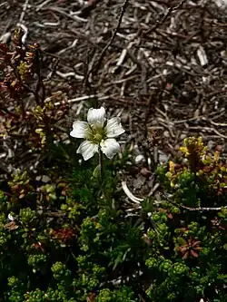 Cherleria obtusiloba is a perennial alpine herb known by the common names alpine sandwort and twinflower stitchwort. It is native to the mountains of western North America from the High Sierra of California to the Colorado Rockies north to Alaska, and to far northeastern Russia (Magadan, Kamchatka, and Yakutia).[2] This is a low plant forming mats or clumps and bearing small thimble-shaped flowers with curving white petals.