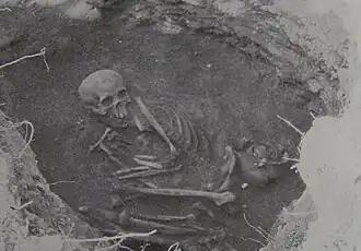 Bodies that were buried outside were covered with rocks and dirt, and then later covered by other dead bodies, which would also be covered with rocks, dirt, and other bodies. These piles of bodies would eventually form large burial mounds. New burial mounds were started when a priest died.[2] In some instances bodies were placed on an elevated, exposed surface and then covered with stones, creating stone heaps that were at least four to five feet high.[5]