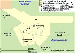 - ^ a b c d e f g h i j "Pennsylvania WildsDarkSkies: An Early Implementation Conceptualization for Cherry Springs State Park" (PDF). Fermata Inc. December 2004. Archived from the original (PDF) on December 14, 2007. Retrieved March 20, 2009. Note: the official map of the park before the Cherry Springs Airport was added to its territory is on page 5.
