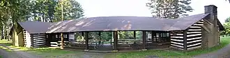 Men from CCC Camp S-88-Pa, based at nearby Lyman Run in Potter County,[27] were also active in the park. In 1939, they built a structure at Cherry Springs which is "the largest and most unique of the CCC-built picnic pavilions" in the state, and is listed on the National Register of Historic Places.[21] The pavilion overlooks PA Route 44 and is shaped like an H, with two partially enclosed structures (the vertical lines of the H) connected by a breezeway (the horizontal bar). The breezeway is a roof supported by eight log columns with log railings. The ends of the pavilion are built from log walls with white chinking, like log cabins. Each end has a large opening to the breezeway in one wall, while the other three sides are fully enclosed with a large window in the wall facing the highway, a stone fireplace and chimney on the opposite wall, and a door flanked by windows on the wall opposite the breezeway.[3][21][28]