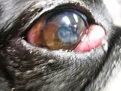 Cherry eye is a disorder of the nictitating membrane (NM), also called the third eyelid, present in the eyes of dogs and cats.[1] Cherry eye is most often seen in young dogs under the age of two.[2] Common misnomers include adenitis, hyperplasia, adenoma of the gland of the third eyelid; however, cherry eye is not caused by hyperplasia, neoplasia, or primary inflammation.[3] In many species, the third eyelid plays an essential role in vision by supplying oxygen and nutrients to the eye via tear production.[4] Normally, the gland can turn inside-out without detachment.[3] Cherry eye results from a defect in the retinaculum which is responsible for anchoring the gland to the periorbita. This defect causes the gland to prolapse and protrude from the eye as a red fleshy mass.[3] Problems arise as sensitive tissue dries out and is subjected to external trauma[3] Exposure of the tissue often results in secondary inflammation, swelling, or infection.[3] If left untreated, this condition can lead to dry eye syndrome and other complications.[4]