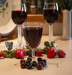 Cherry juice is a mass-produced food product that is consumed as a beverage and used as an ingredient in various foods, processed foods and beverages.[4] It is sometimes used as an ingredient in cherry ice cream and in cherry pie filling.[5][6] It is also used as an ingredient in cherry brandy and cherry bounce.[7][8] Cherry jelly has also been produced using the juice.[9] Cherry juice concentrate is used by food manufacturers in the production of fruit juice blends.[10] Cherry juice from the Montmorency cherry is used to produce cherry essence, which is used as a flavor concentrate by food manufacturers.[11]