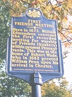 The first recorded meeting of Friends in the province of Pennsylvania was in Chester at the house of Robert Wade in 1675.[1] William Edmundson, the founder of Quakerism in Ireland was present at the first meeting.[2]