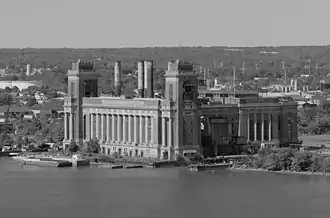 The original section of the Station building was built in 1916, and consists of the Boiler House with attached Coal Towers and Turbine Hall, and the Switch House. The complex was designed by architect John T. Windrim and engineer William C.L. Eglin, and featured then recent advances in generating technology and industrial construction.[2] The principal facades were designed in the Beaux-Arts style.