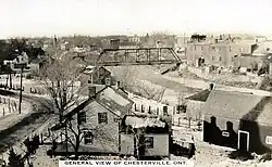 In July 1872, a telegraph office was opened in the village.[7] Because the names of many local communities included the name Winchester (such as Winchester Township, West Winchester, East Winchester, North Winchester, and Winchester Springs), the Montreal Telegraph Company suggested that the name of the village be changed to avoid confusion. After a petition was circulated, the name was officially changed to Chesterville in 1875.[8][9]