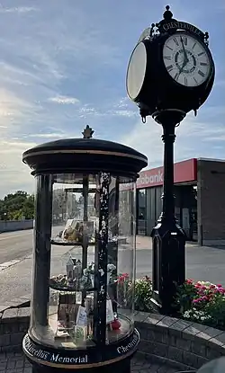 The Chesterville “clock tower” was unveiled on July 8, 2000, as part of a millennial project by the Rotary Club of Chesterville. It is located downtown at the intersection of Main and King streets. A kiosk stands beside the clock, built in honour of Leon Marcellus, a prominent Chesterville businessman, and hosts regular historical displays. The clock tower was refurbished in 2022.