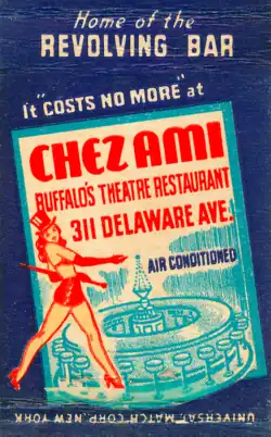 The Chez Ami, known as the Chez Ami Supper Club, was located at 311 Delaware Avenue in Buffalo, NY and first opened its door in 1934. It is considered one of the first supper clubs in the nation and had the first rotating bar in the United States. The club was owned and operated by Philip Amigone until his death in 1965. It was subsequently torn down in 1974.[1]