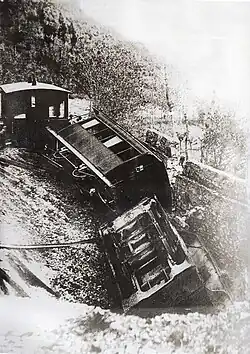 In the following years there were two other serious accidents; one occurred on the morning of 13 November 1907 at Testi,[35] when due to a landslide caused by the heavy rains of the previous days, the track on which the train was running plunged into the Greve River causing numerous injuries; the balance of this accident was modest thanks to the valor of engineer Giuseppe Testi, who perceived the subsidence of the ground: sensing the derailment he managed to brake by operating the counter-steam. The locomotive overturned and Testi and his stoker were trapped inside; only later were they rescued. For his act, the mayor of Greve awarded the engineer a solemn commendation and a cash prize.[34] Another serious accident occurred on 11 December 1913 at Le Strette, near Falciani, when two convoys coming from opposite directions collided head-on: this time, too, there were numerous injuries and the two locomotives were destroyed.[35]