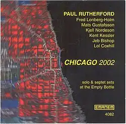 Chicago 2002 is a live album by trombonist Paul Rutherford. It was recorded on April 26 and 27, 2002, at The Empty Bottle in Chicago, and was released later that year by Emanem Records. The album features an extended Rutherford solo followed by three tracks on which he is joined by saxophonists Lol Coxhill and Mats Gustafsson, trombonist Jeb Bishop, cellist Fred Lonberg-Holm, bassist Kent Kessler, and percussionist Kjell Nordeson.[1][2][3][4][5]
